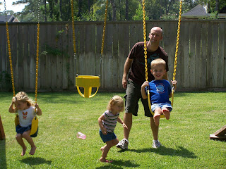 Luckily, his teacher was quite good and he was happy before too long and doing his own version of "swimming".If swim lessons, were not enough to do on the 1st day with just the boys. (Can you believe I just have boys at home? ) We had our Mother's of Young Children Annual back to school luncheon. It is great to have the 1st day go by a little quicker since you are hanging out with friends. Here is Garrett, Claire and Rose enjoying the pushing talents of Jeremy. They don't look like there are missing their siblings, do they?